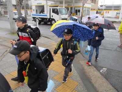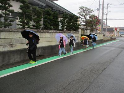 小雨が降り、傘をさす姿が多くみられた今日の登校風景。傘で歩きにくそうにしている低学年の児童もいましたが、通学班がまとまり、ルールとマナーを守って登校していました。