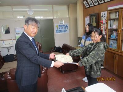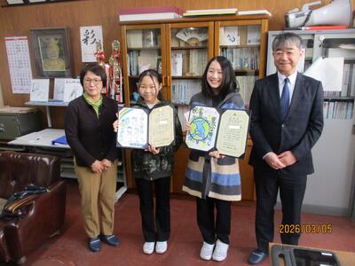 活躍する中部っ子!part74 投稿: 校長 (03/05) 寒河江税務署長さん、寒河江法人会女性部会部会長さん、税務署財務事務官さん、法人会専務理事さんの4名が来校され、6年生児童2名を表彰してくれました。 公益社団法人寒河江法人会主催絵はがきコンクール 税務署長賞 6年児童 公益社団法人寒河江法人会女性部会主催絵はがきコンクール 法人会長賞 6年児童 心温まる素敵な絵葉書を描いてくれました。 笑顔で受賞、おめでとうございます。