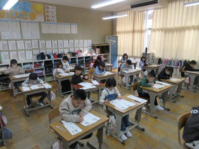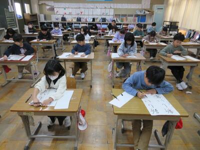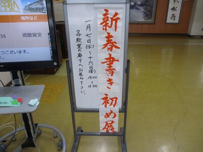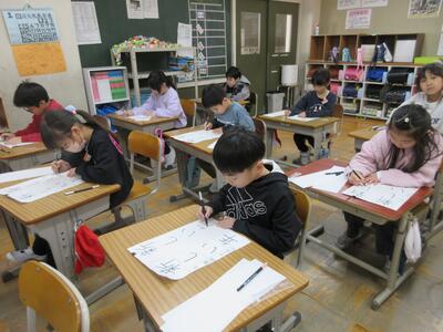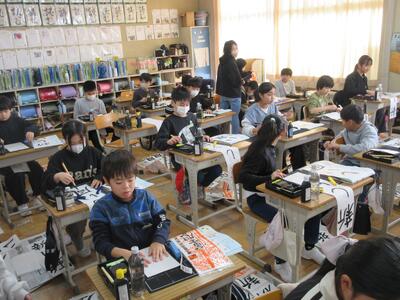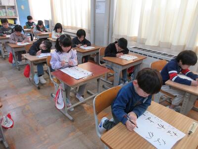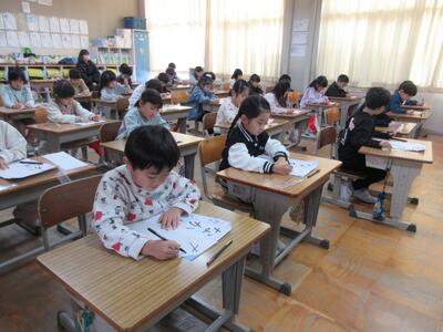 新年の書初め! 投稿: 校長 (01/08) 先日(1月6日)、技術の向上を願い、筆に決意を込めて書初めを行いました。1月7日から16日まで、各教室の廊下に展示します。是非、中部っ子の力作をご覧になってください。鑑賞時間帯は15時~16時45分です。 【職員玄関前の案内】 【「春の海」の曲を流し、書初めの抱負を放送】 【雅な雰囲気の中、集中する中部っ子たち】
