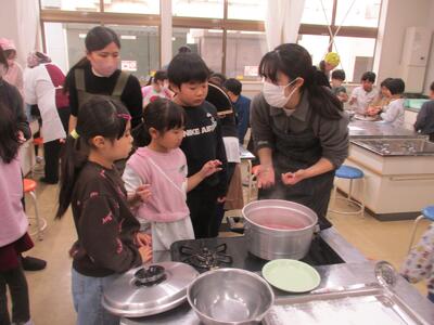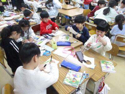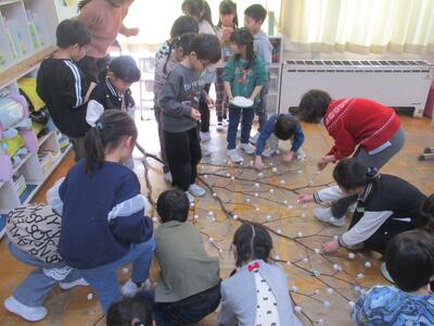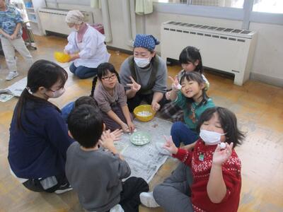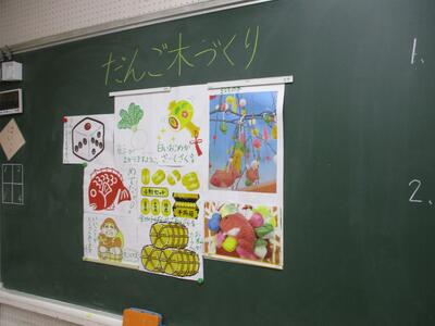 だんご木つくりは小正月(1月16日)に豊作や無病息災、家内安全、五穀豊穣を願う古くから庶民の生活に根差してきた楽しい行事。昔のように各家庭でその行事を楽しむことはありません。その代わりといっては変ですが、毎年、学校や保育園、学童などで、だんご木つくりを楽しむことが多くなっています。本校では、昔かたりの会の方と保護者の方よりご協力をいただき、1年生がその行事を楽しみました。