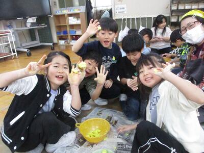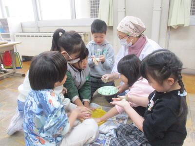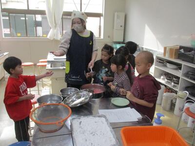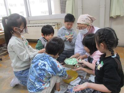 ☆昔語りの会と保護者の方々からお手伝いをいただき、だんご木つくりを開始。
