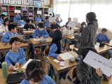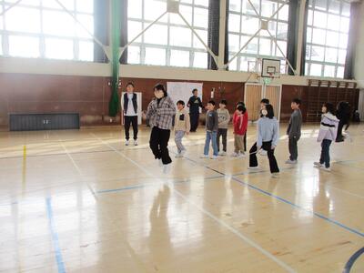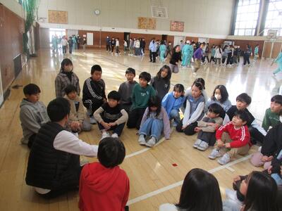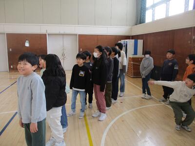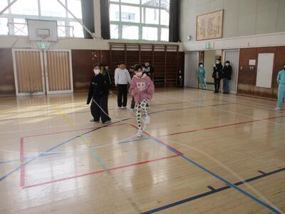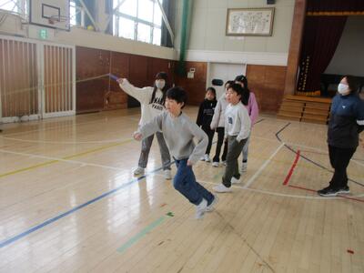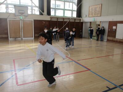 なわとびクラスマッチ4年! 投稿: 校長 (11:07) 今日は、4年生。 ルールは3年生と同じ、3分間で長縄を累計何人跳べるかを競います。 体育館に、各クラスの大きな掛け声が響きわたりました。 果たして・・・・・・・・・。 優勝 3組! おめでとうございます。 回数(人数)は87回。 昨年の方が回数が多かったと言ってましたが、満面の笑顔。 (そういえば、回数は先週の3年生の方が多かった・・・・・・。なぜだろう?)