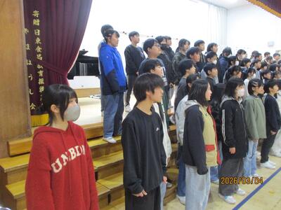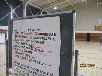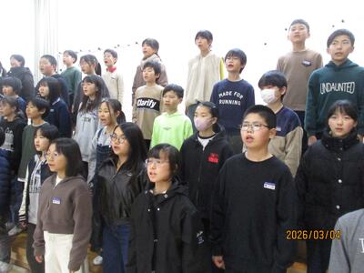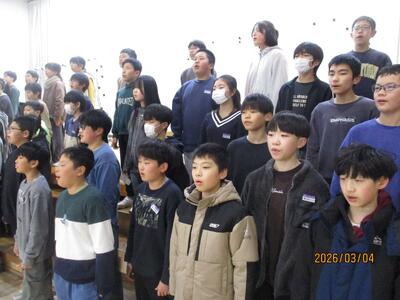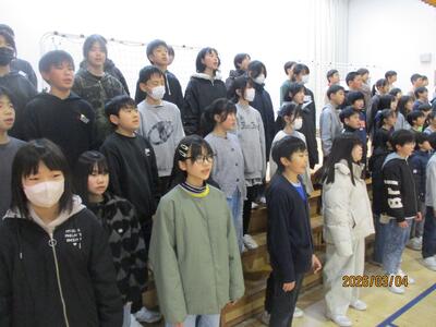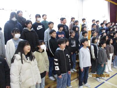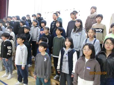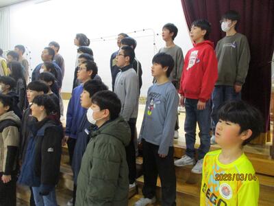 卒業を控えて・・・ 投稿: 校長 (03/04) 一昨年まで本校で勤務していた奥山先生(現在:高松小学校)より、卒業式で歌う合唱の指導を6年生にしていただいています。その合唱の練習を聞いているだけで、ちょっと目頭が熱くなりました。寂しくなりますが・・・・まもなく卒業ですね。 きれいな歌声でした・・・・・・。