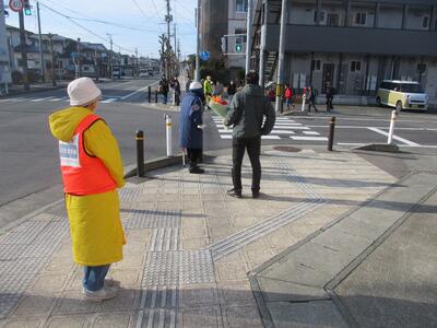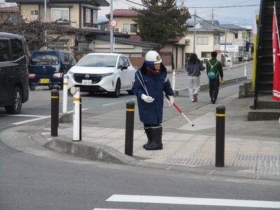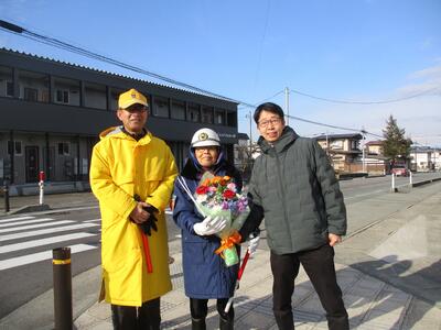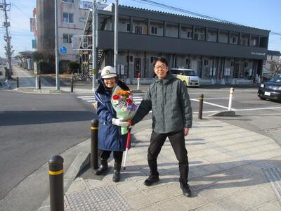 今日は、前校長の那須先生(現・東部公民館館長)も花束をもって交差点に駆けつけてくれました。そして、主任児童委員の方もあいさつにこられました。